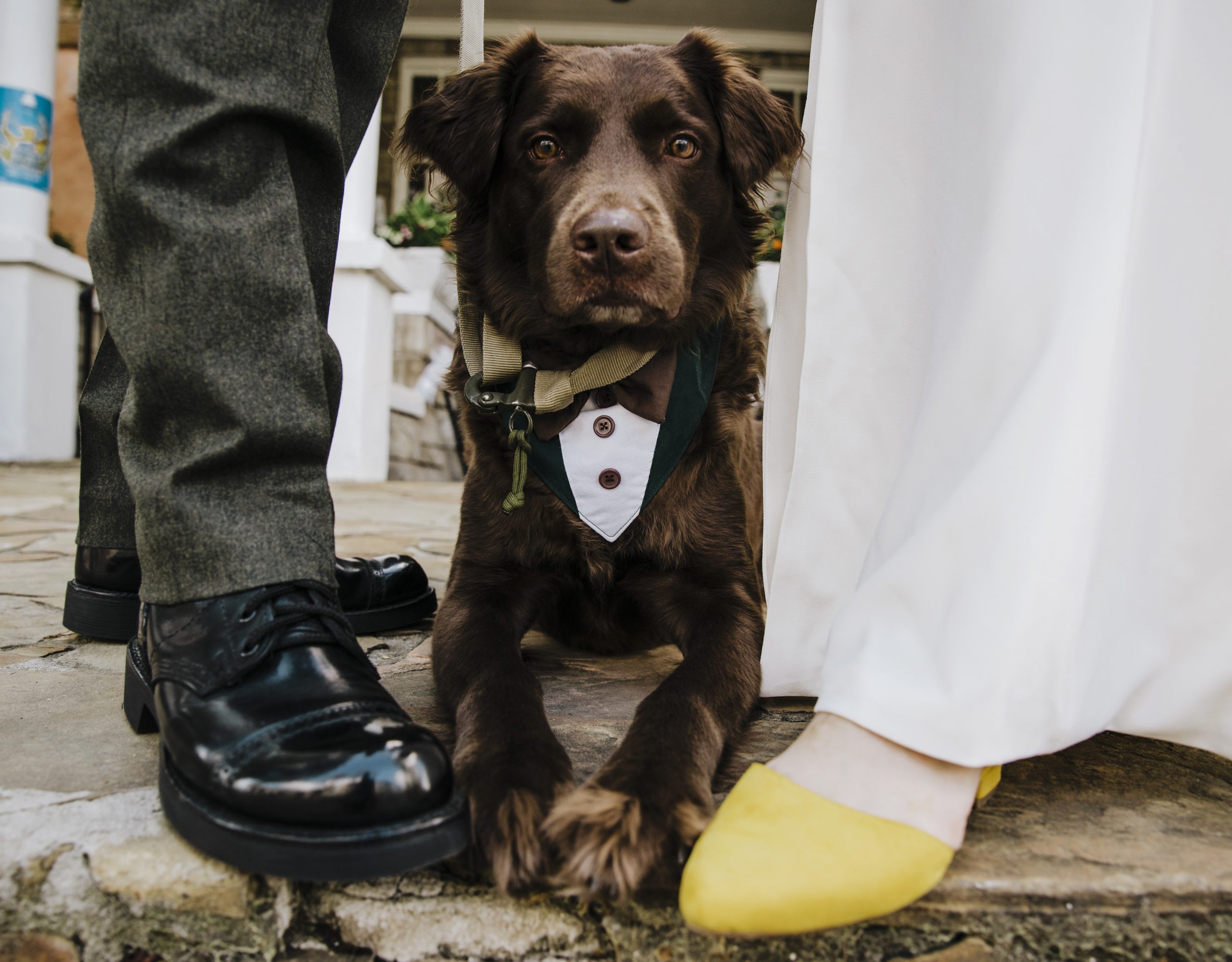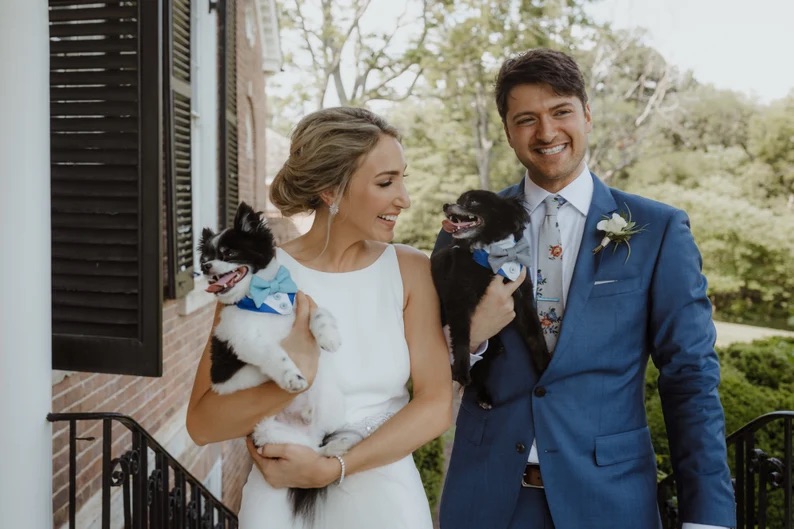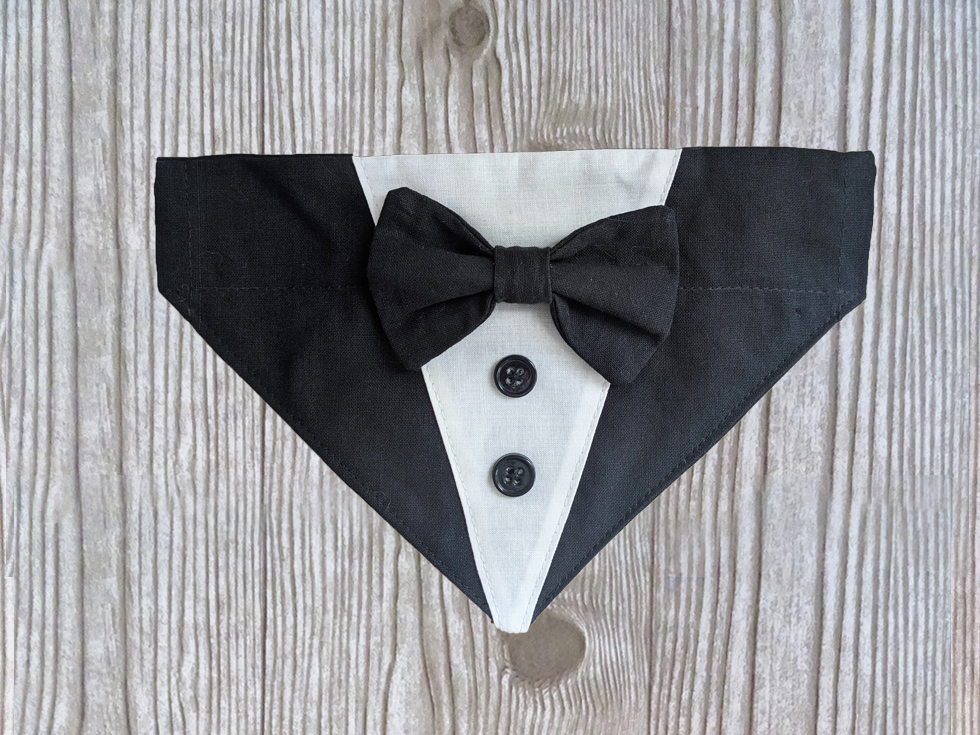 Made-to-order from upcycled men’s clothing. Attached with slip-on loop for collar. Choose a custom primary (jacket) color and bowtie color to match your wedding palette.